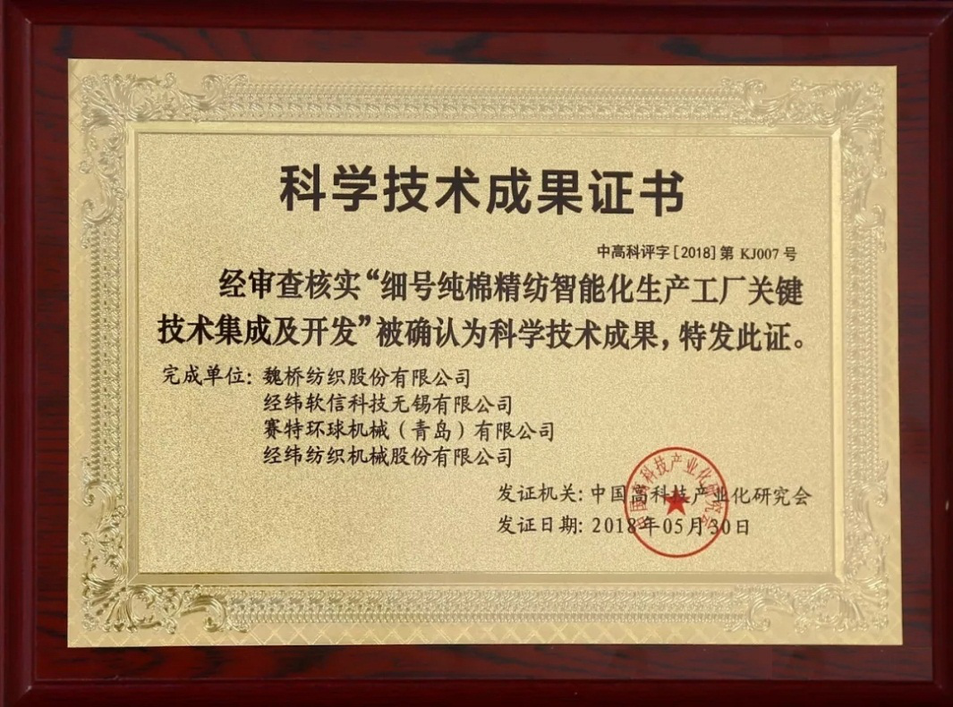 Weiqiao Textile Company Limited was recently recognized for its Scientific and Technical Achievement by the China High-tech Industrialization Association for its “Integration and Development of the Key Technologies for Fine Pure Cotton Spinning Intelligent Production Factory.”