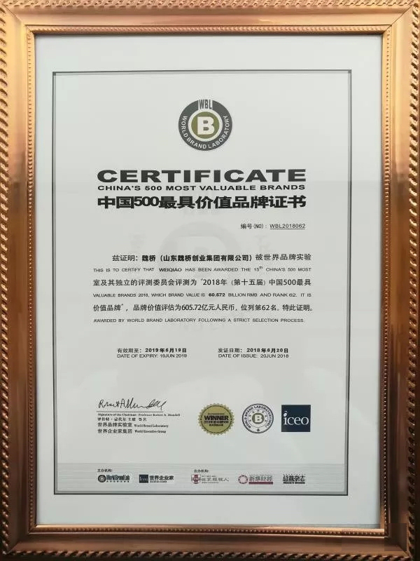 Brands from twenty-five industries, including food and beverage, textile and apparel, cultural media, information technology and household appliances were assessed in the 2018 report. Weiqiao ranked second among 33 brands from the textile and apparel industry and 40th among Shandong provincial brands.