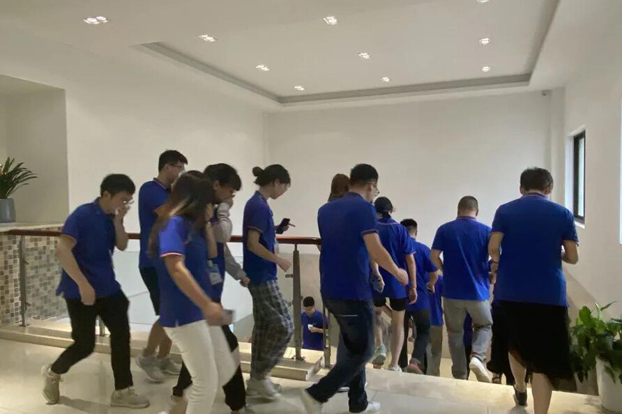 上午9时,随着消防警报的拉响,各部门按照应急防护要求沿消防通道迅速、有序转移到安全处,各部门负责人清点人数,确保全员安全撤离。