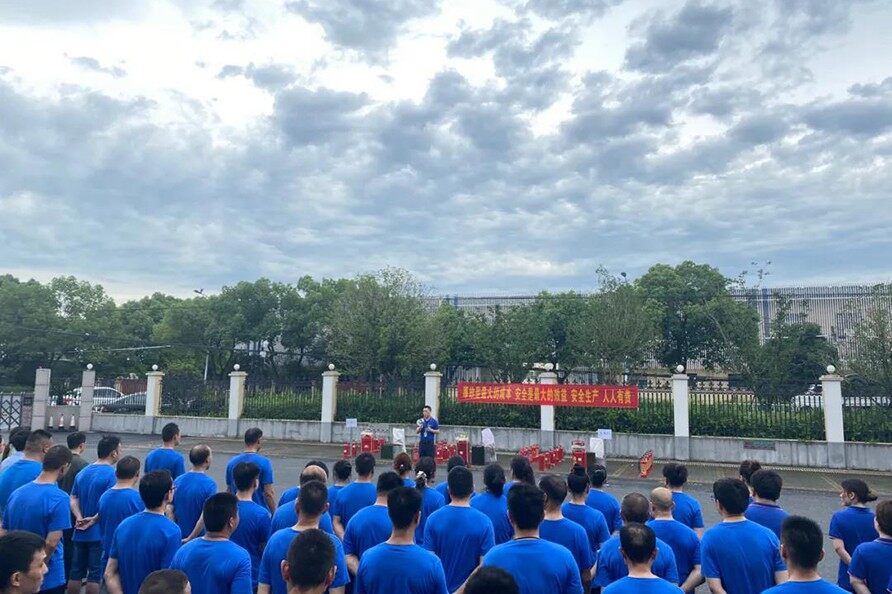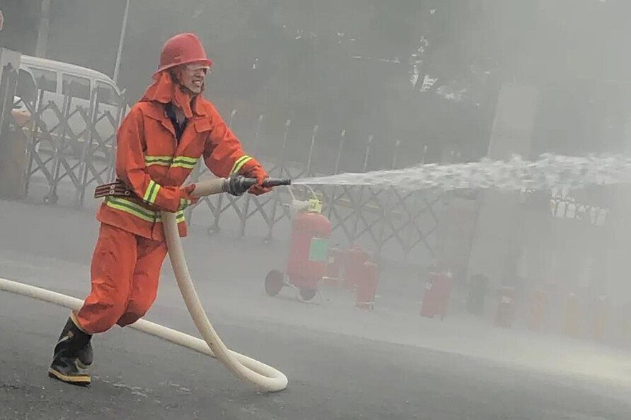 ·在安全部门的指导下,部分员工还穿着防护服参与了消防水带的使用演练。